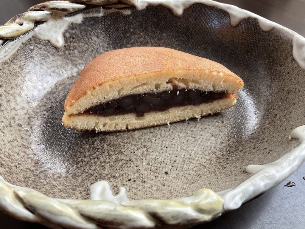 見てください、このふっくらとした生地の厚み! 豊月堂さんのどら焼きの皮は、蜂蜜をたっぷりと使っているのが特徴で、口に入れるとしっとり、そして優しい甘さが広がります。 中には、自慢のつぶあんが端までぎっしり。小豆の粒感がしっかり残っていて、「あんこを食べてる!」という満足感がすごいです。 これぞ、王道にして至高のどら焼きですね。